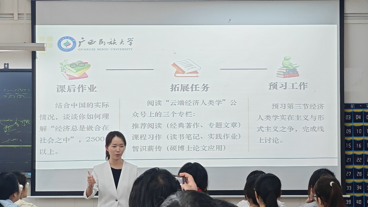 课堂以“实在主义的嵌合理论及其中国化”为主题, 采用翻转课堂教学模式。课前,学生通过在线平台完成了指定文献阅读和案例分析;课堂上,各学习小组围绕“天等县指天椒特色产业”、“石山塱的存续之道”、“税收优惠政策”三个议题展开深入研讨,对如何理解“经济总是嵌合在社会之中”这一命题进行了多角度的阐释和论证。龙丽婷老师通过启发式提问和针对性点评,引导学生将理论知识与田野调查案例相结合,课堂气氛活跃,师生互动良好。