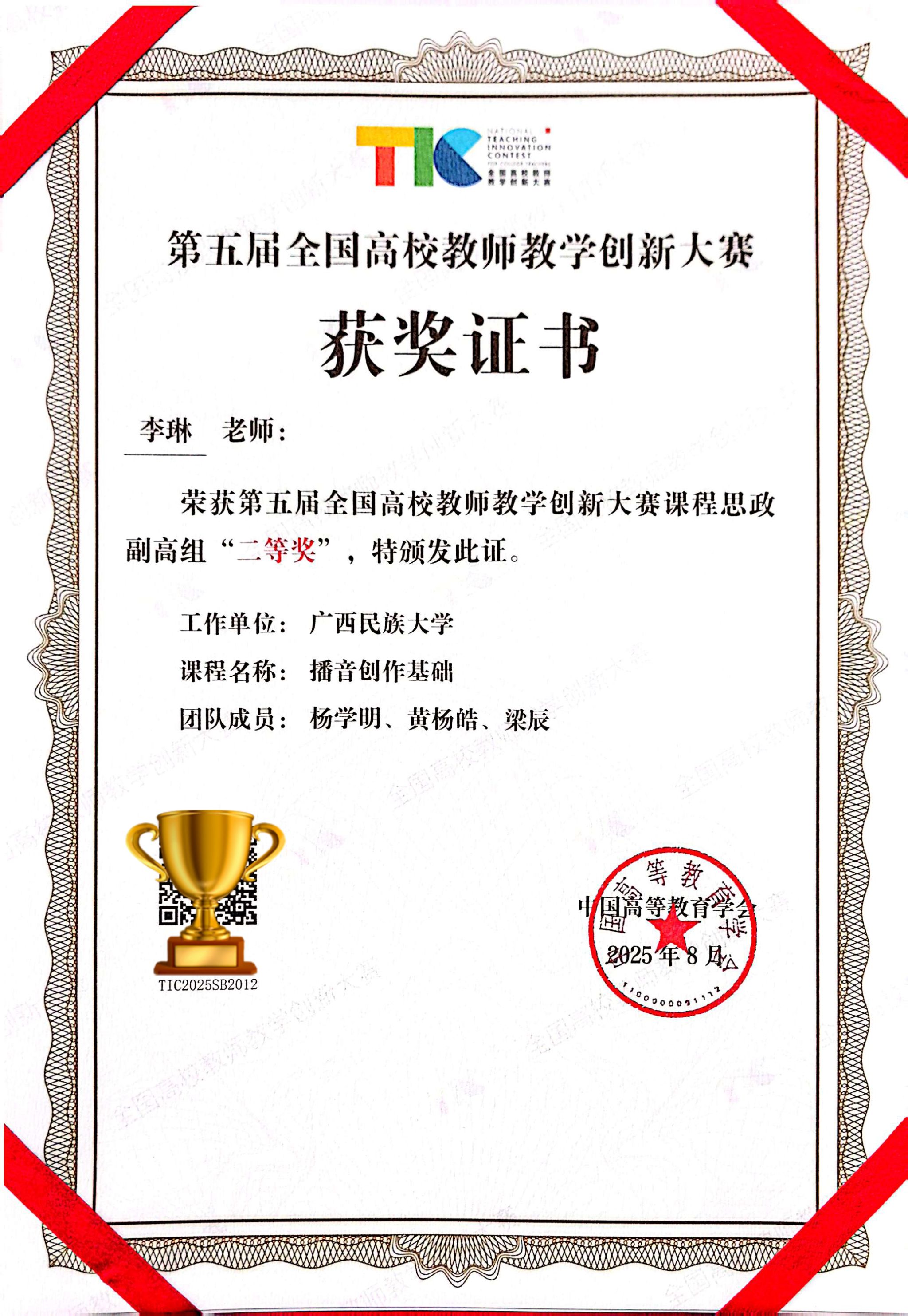 传媒学院播音与主持艺术专业教师李琳及其团队凭借《播音创作基础》课程的创新实践,荣获第五届全国高校教师教学创新大赛课程思政副高组二等奖。